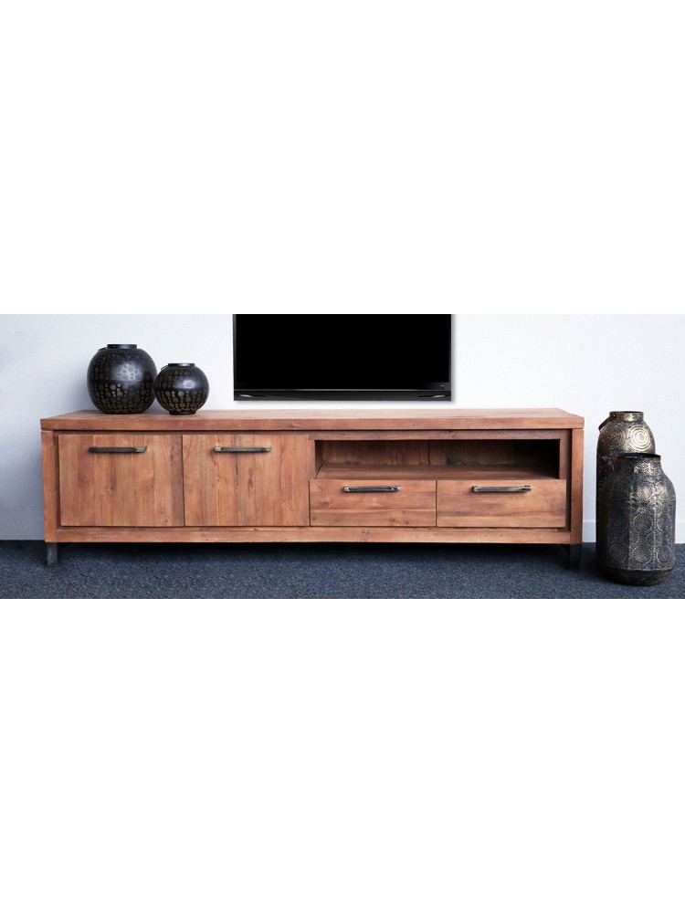 Deze tv-kast bestaat uit 100% gerecycled teakhout, erg goed voor ons milieu. De indeling van de tv-kast is ideaal met twee deuren en twee lades. De afwerking van de grepen en poten zijn industrieel, zie detail foto's.